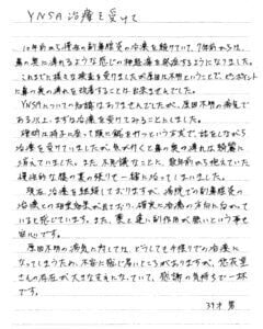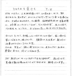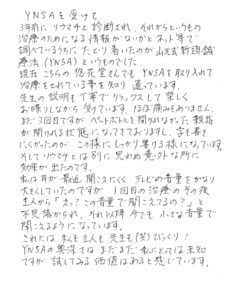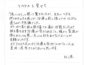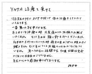 何とかこの痛みをとる事はできないものか川口先生に相談に乗って頂きました。そしてこのYNSAの治療についてお話を伺い、早速、母に施術していただきました。